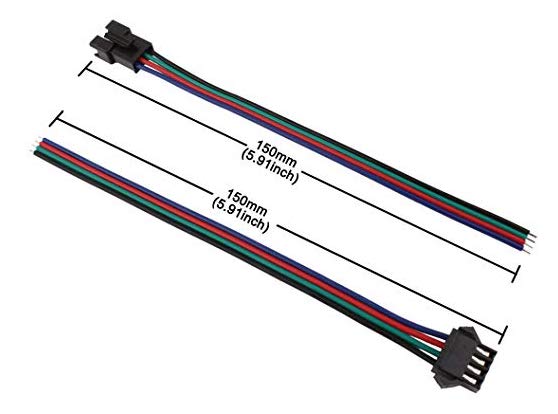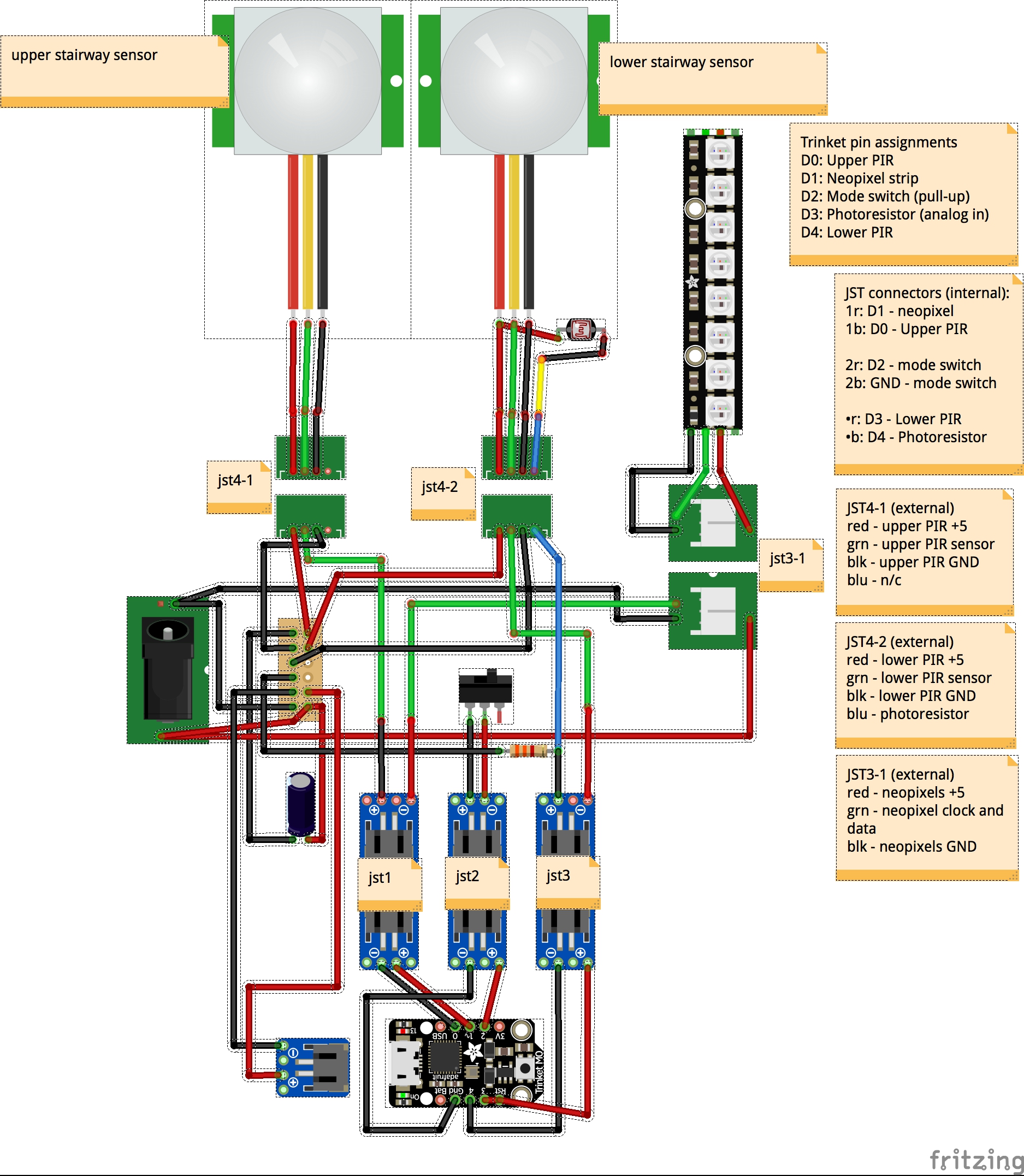 Later, when I was trying to install the system, it became clear that having the wiring hardwired between PIRs and the electronics enclosure was sub-optimal. So, more JST connectors. This time some full sized 4 pin ones. The LED strip came with 3 pin connector, so nothing more was needed for that.