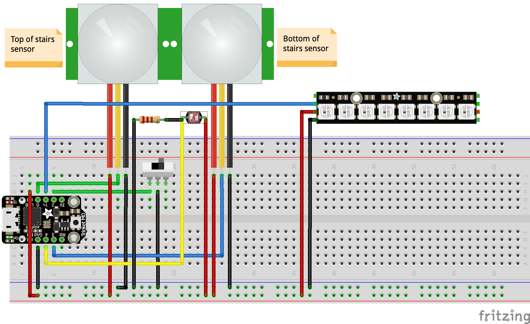 In my parts bin I found everything I needed to prototype the project. My parts bin was primarily source from AdaBoxes I had received by way of a subscription. The prototyping effort went quickly and I had a proof of principle running in a couple of hours. This should be an easy project to do.
